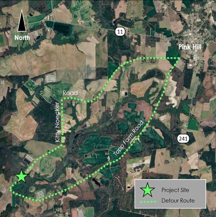 This project includes the replacement of the SR 1704 (Kitty Noecker Road) bridge (Duplin Co. Bridge No. 144) over Panther Creek in an unincorporated area of Duplin County, south west of Pink Hill, NC. An offsite detour was selected for the project using nearby Tapp Farm Road. Special coordination was carried out with utility providers due to the proximity of utilities and their potential for construction concerns.